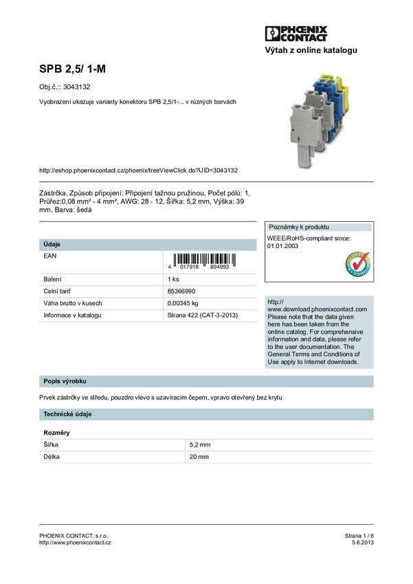 Wtyk Phoenix Contact SPB 2,5/ 1-M 3043132, 50 szt.