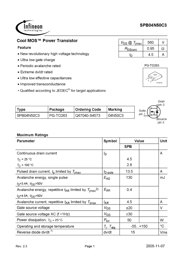 Trans MOSFET N-CH 500V 4.5A 3-Pin TO-263 T/R