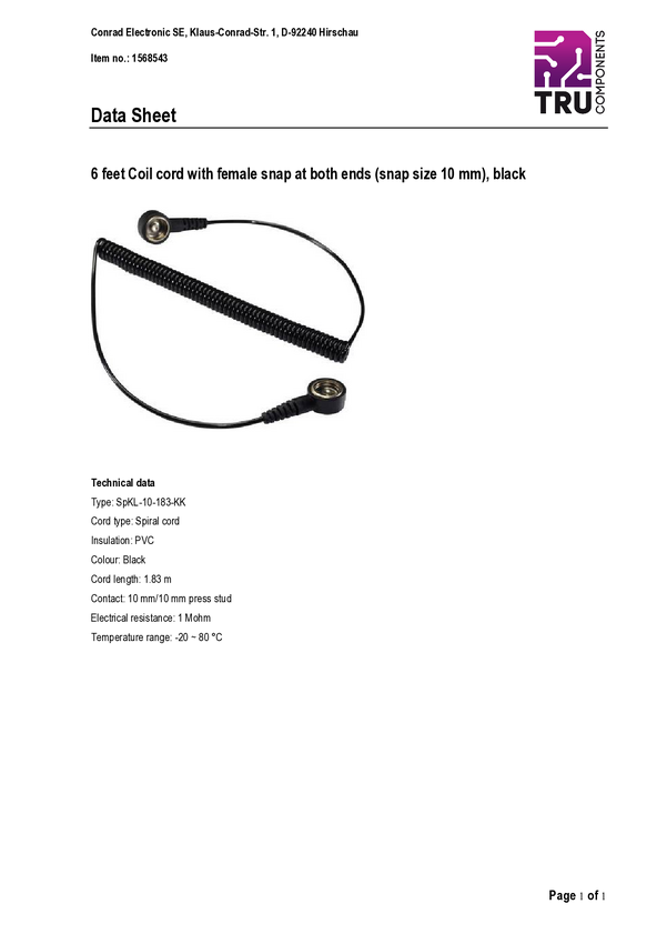 TRU COMPONENTS SpKL-10-183-KK Przewód uziemiający ESD 1.83 m przycisk 10 mm