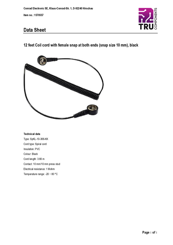 TRU COMPONENTS SpKL-10-183-KK Przewód uziemiający ESD 3.66 m przycisk 10 mm