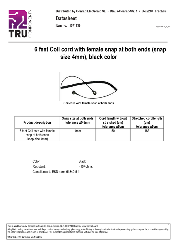 TRU COMPONENTS SpKL-4-183-KK Przewód uziemiający ESD 1.83 m przycisk 4 mm