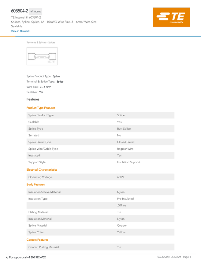 TE Connectivity TE AMP Other Insulated Terminals and Splices 603504-2, 1 szt.