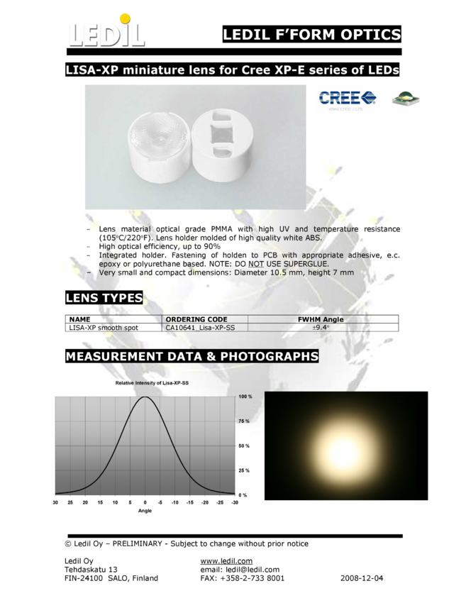 Soczewka LISA-XP-SS, Smooth Spot, ±9.4&deg,do diod LED High Power CREE seria XP-E, Ledil