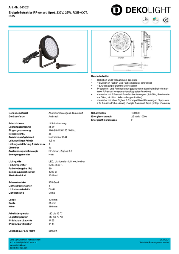 Zewnętrzna lampa punktowa LED Deko Light RF-smart, Spot, 230V, 25W, RGB+CCT, IP65 843521 25 W 1700 lm IP65, IP44 (wtyczk