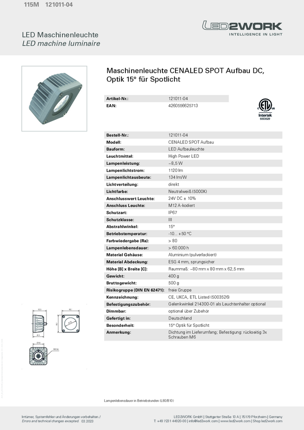 Oświetlenie LED LED2WORK CENALED SPOT 8.5 W 1120 lm 65 ° 24 V/DC 1 szt.