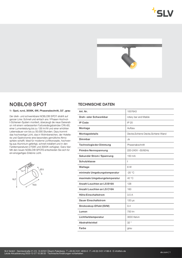 Reflektor szynowy LED SLV Noblo Spot 1007643 1-fazowy 6.2 W LED 750 lm szary