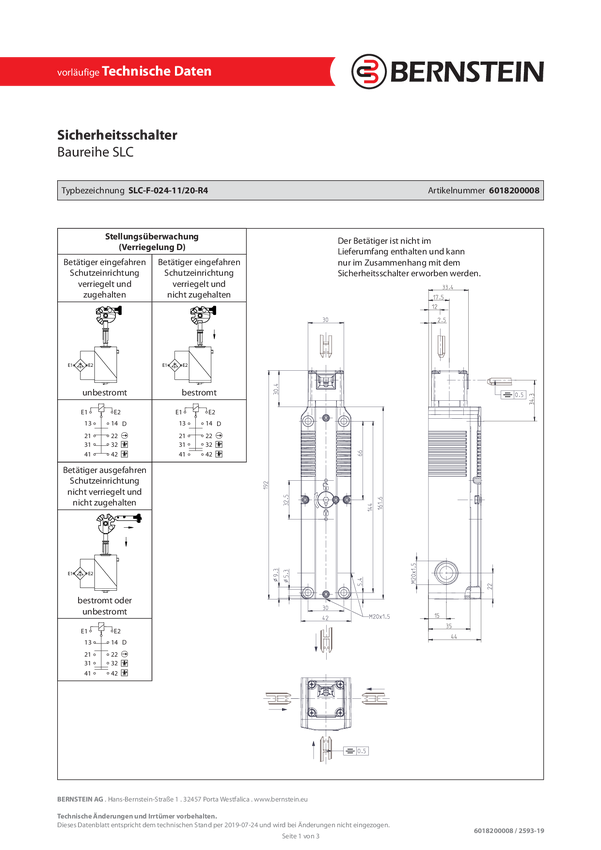 Bernstein 6018200007 SLC-F-024-20/20-R4 Wyłącznik bezpiecznikowy oddzielny siłownik zamek sprężynowy IP67 1 szt.