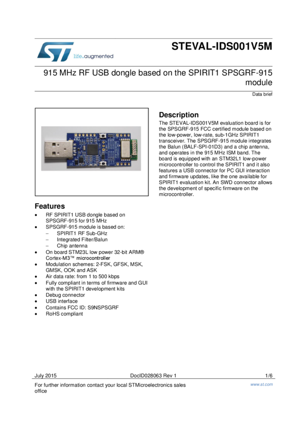 915 MHz RF USB dongle based on the SPIRIT1 SPSGRF-915 module