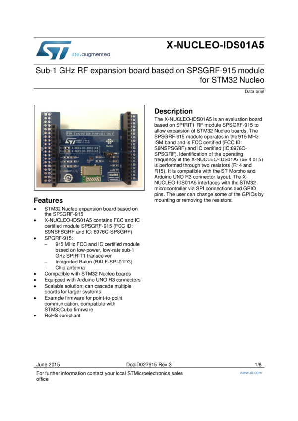 Sub-1 GHz RF expansion board based on the SPSGRF-915 module for STM32 Nucleo