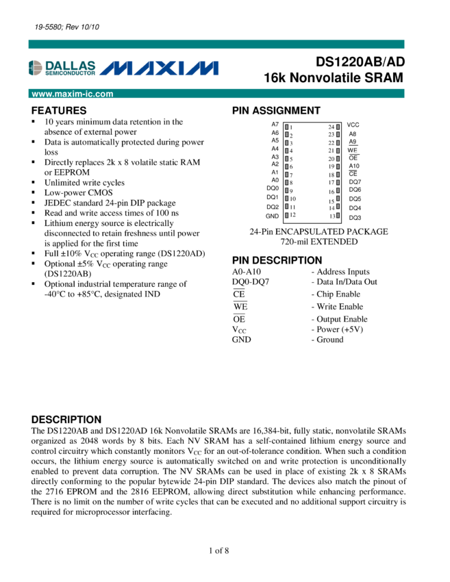 DS1220AB, DS1220AD 16k Nonvolatile SRAM
