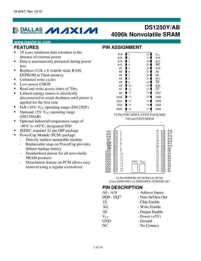 DS1250AB, DS1250Y 4096k Nonvolatile SRAM
