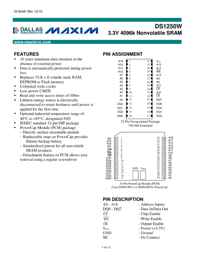 DS1250W 3.3V 4096k Nonvolatile SRAM