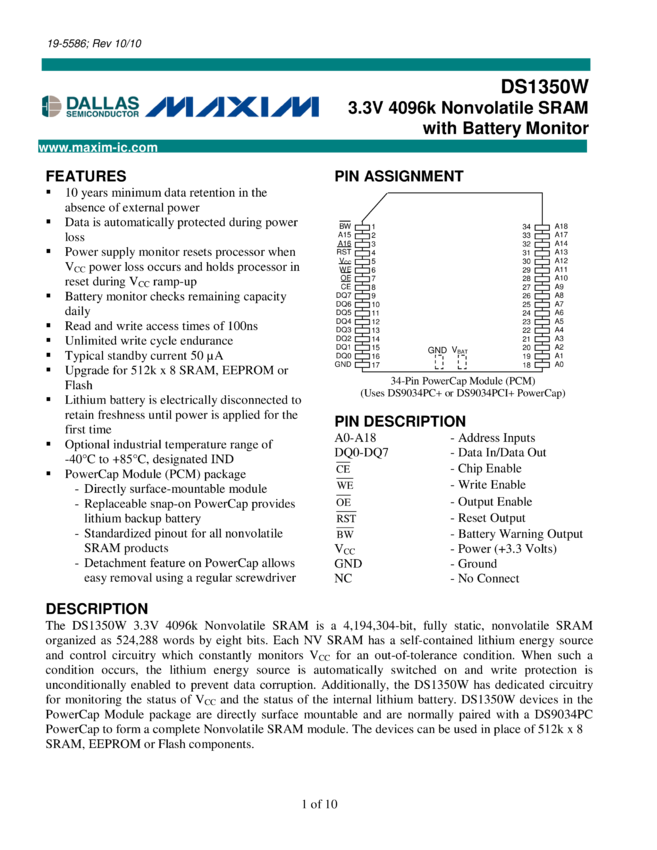 DS1350W 3.3V 4096K Nonvolatile SRAM with Battery Monitor