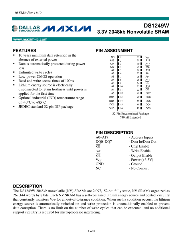 DS1249AB, DS1249Y 2048k Nonvolatile SRAM