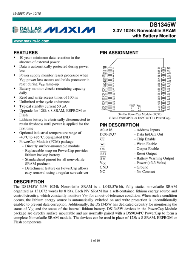 DS1345W 3.3V 1024k Nonvolatile SRAM with Battery Monitor