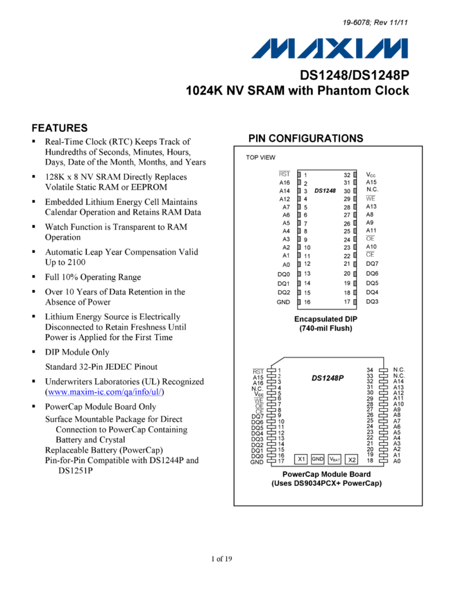 DS1248, DS1248P 1024K NV SRAM with Phantom Clock