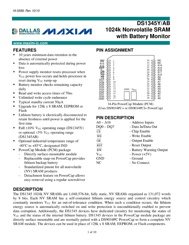 DS1345AB, DS1345Y 1024k Nonvolatile SRAM with Battery Monitor