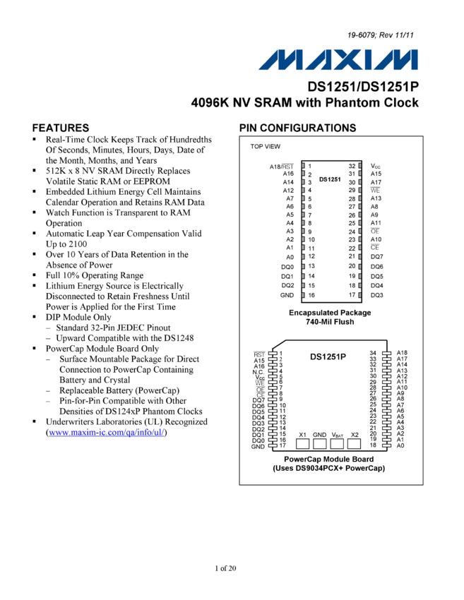 DS1251, DS1251P 4096K NV SRAM with Phantom Clock