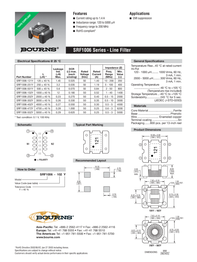 Power Line Filter 10MHz to 200MHz 1.4A 50VDC SMD