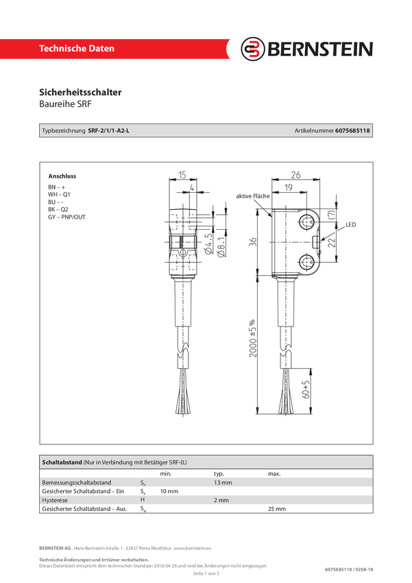 Bernstein 6075685121 SRF-2/1/1-E0,25-L Wyłącznik bezpiecznikowy IP69K 1 szt.