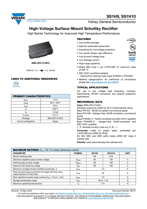 High Voltage Surface-Mount Schottky Rectifier High Barrier Technology for Improved High Temperature Performance