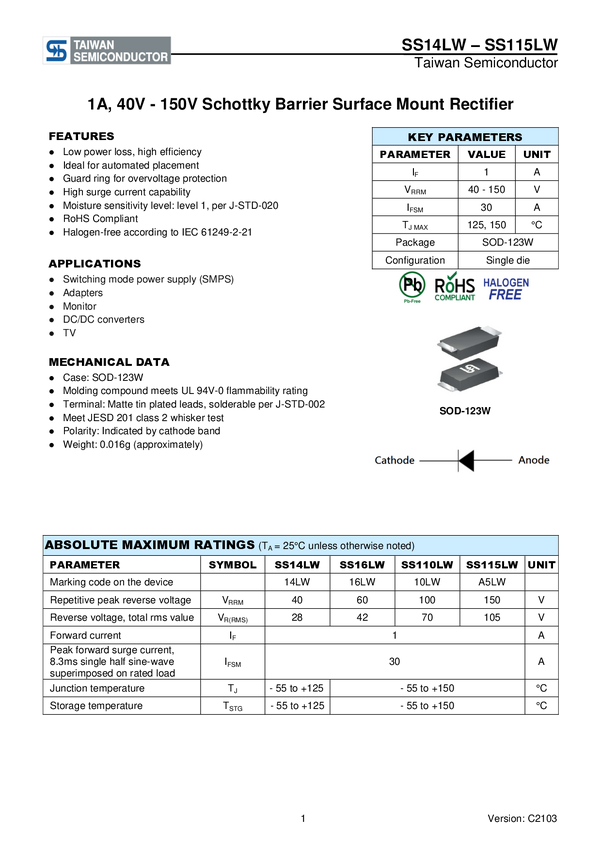 SMD Schottky'ego 40V 1A SOD123W Taiwan Semiconductor SS14LW N/A N/A N/A