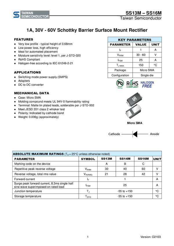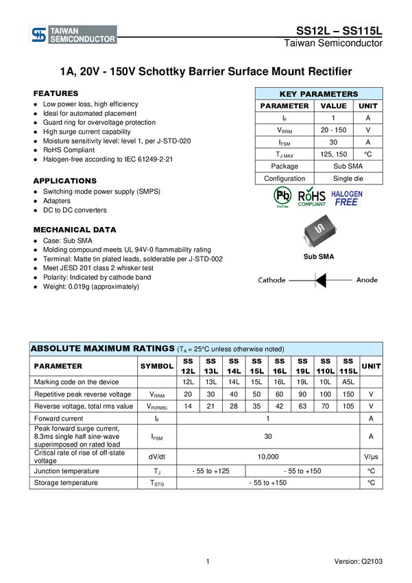 SMD Schottky 40V 1A Sub-SMA Taiwan Semiconductor SS14L N/A N/A N/A U(RRM) 40 V