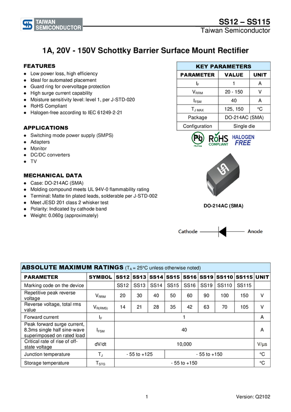 SMD Schottky'ego 40V 1A SMA Taiwan Semiconductor SS14 N/A N/A N/A U(RRM) 40 V