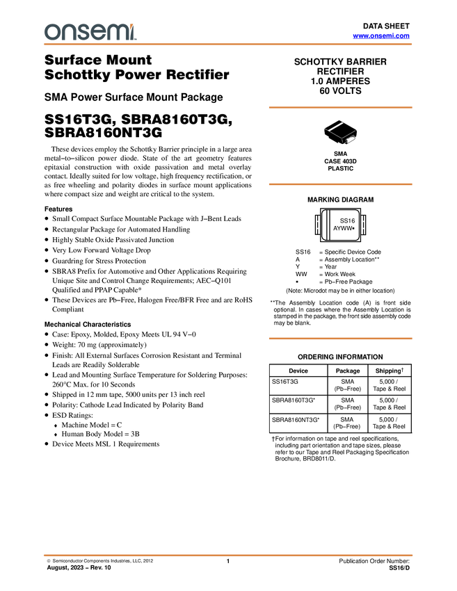 1.0 A, 60 V Surface Mount Schottky Barrier Rectifiers