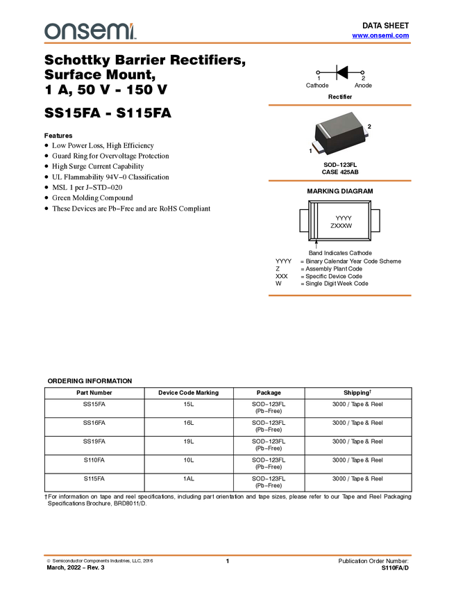 1.0 A, 50 V, Surface Mount Schottky Barrier Rectifiers