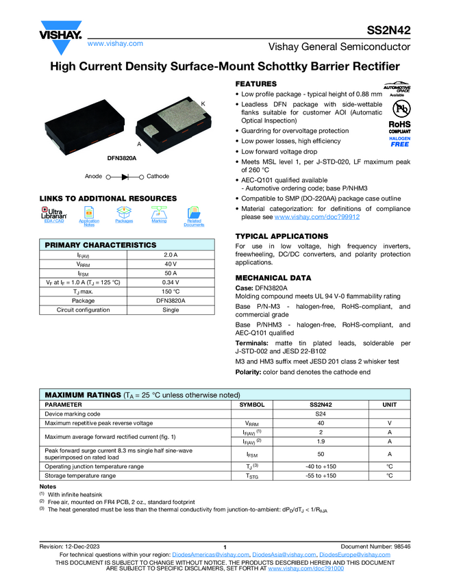 High Current Density Surface-Mount Schottky Barrier Rectifier - High Barrier Technology for Improved High Temperature Performance