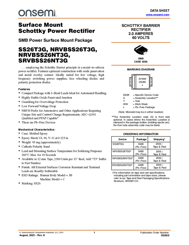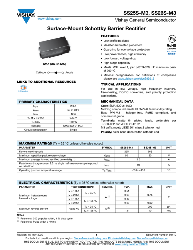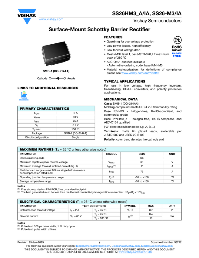 Dioda; SS26-E3/52T; prostownicza; Schottky; 2A; 60V; DO214AA (SMB); SMD; VISHA; RoHS; opakowanie/100szt