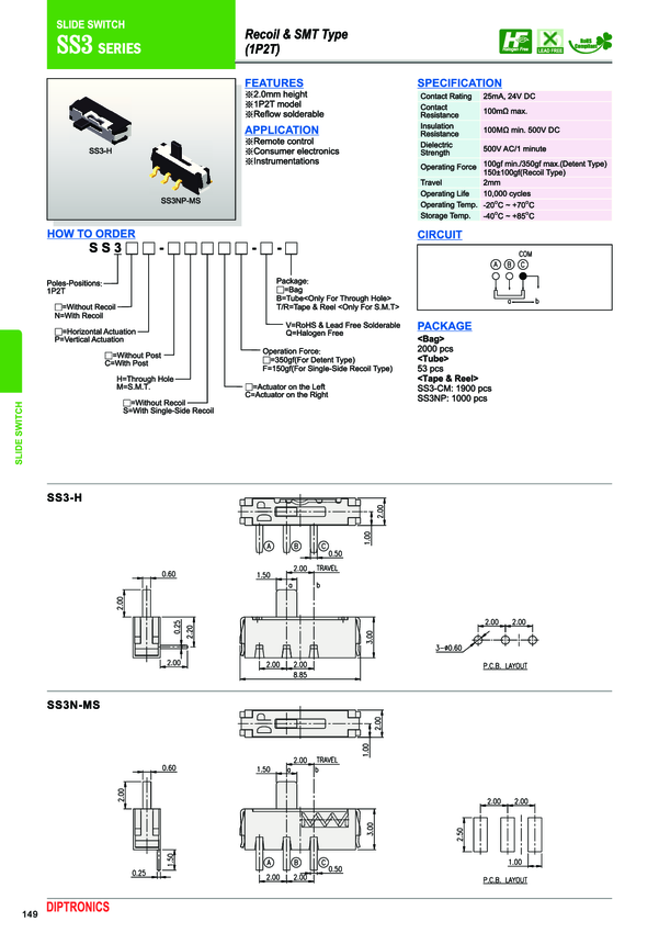 Switch Slide SP2T Side Slide 0.025A 24VDC 10000Cycles Solder SMD T/R