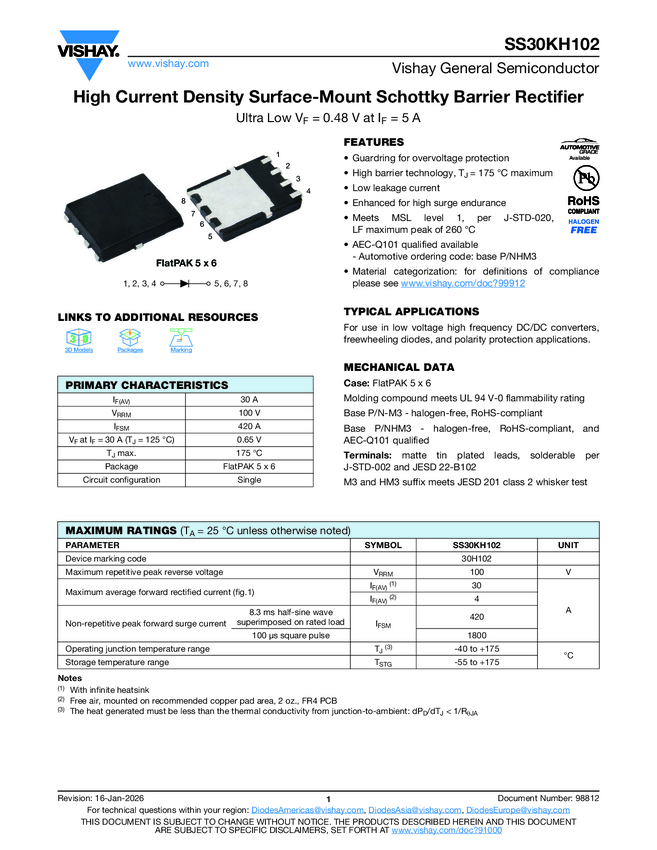 High Current Density Surface-Mount Schottky Barrier Rectifier Ultra Low VF = 0.48 V at IF = 5 A
