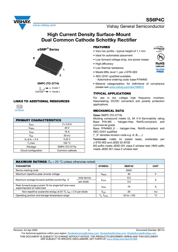 High Current Density Surface-Mount Dual Common Cathode Schottky Rectifier