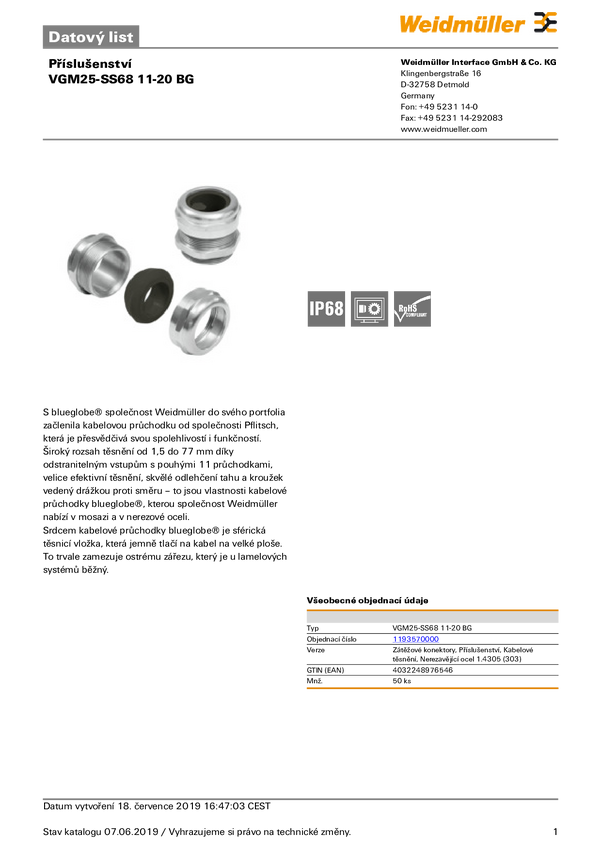 Weidmüller 1193570000 Dławnica kablowa VGM25-SS68 11-20 BG, od 11 mm, do 20 mm, M25, 50 szt.