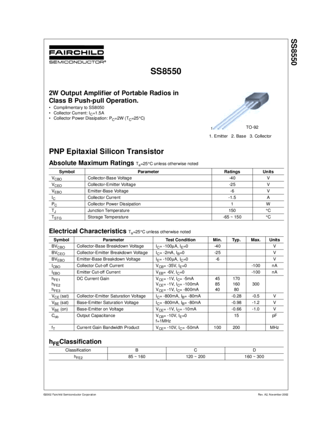 Tranzystor; SS8550; PNP; 1,5A; 25V; 1W; bipolarny; TO92; THT; FAIRCHILD CEMICONDUCTOR; SS8550DBU; op/100szt