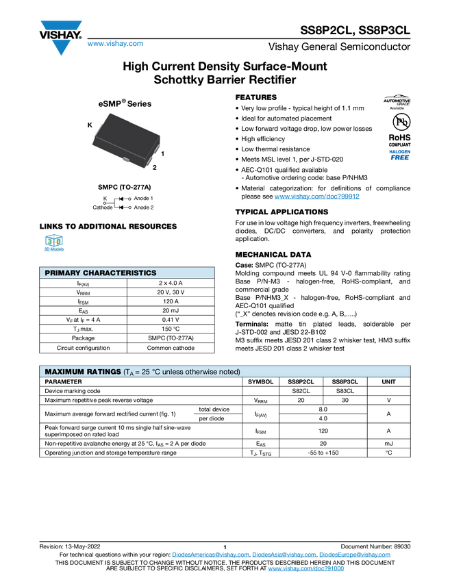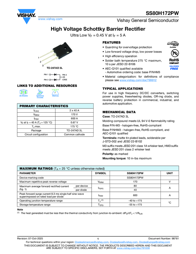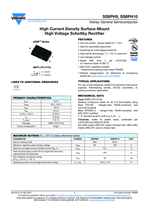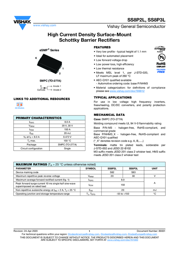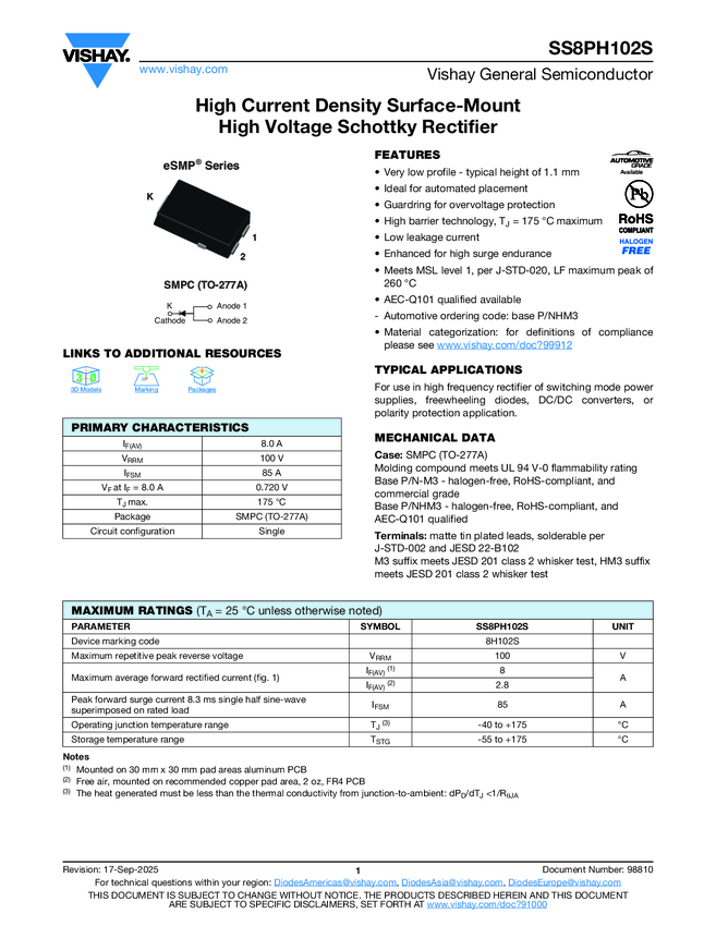 High Current Density Surface-Mount HighVoltage Schottky Rectifiers