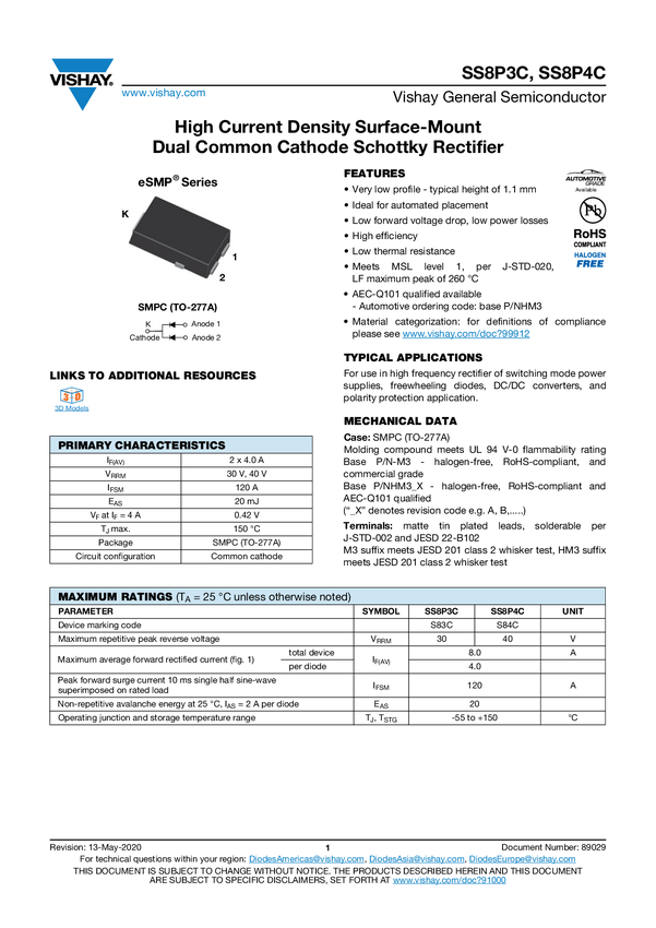 High Current Density Surface-Mount Dual Common Cathode Schottky Rectifier