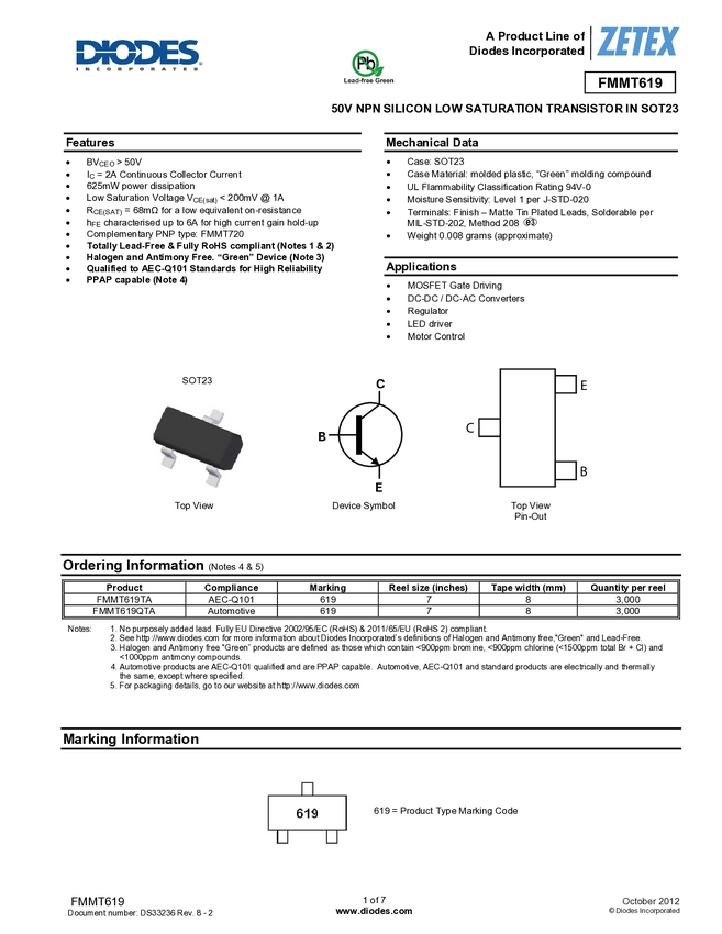 Tranzystor; FMMT619; NPN; 2A; 50V; 625mW; bipolarny; SOT23; SMD; = SS8050; DIODES INCORPORATED; RoHS; opakowanie/100szt