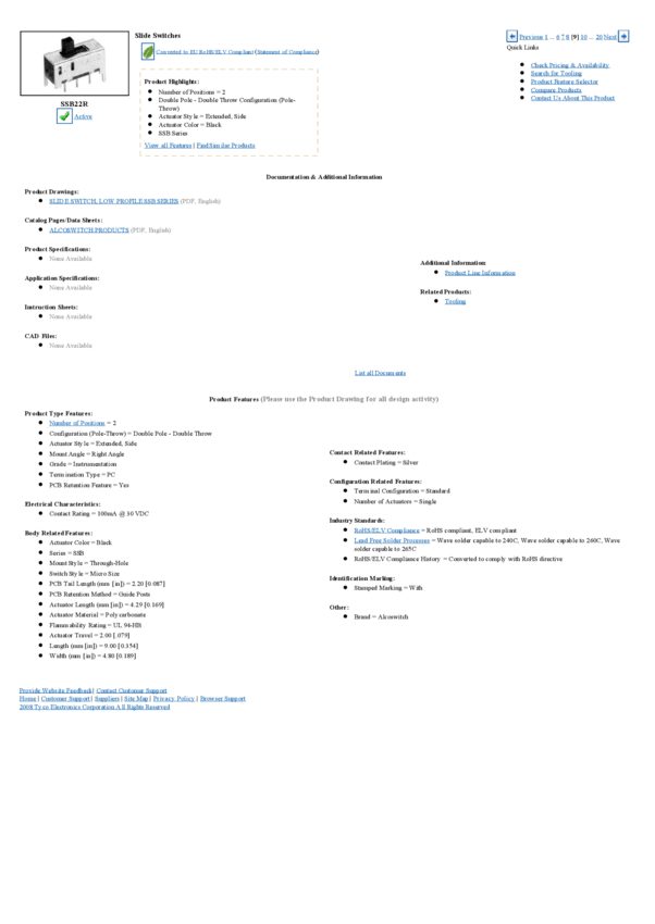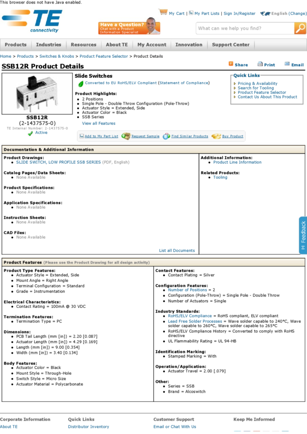 Switch Slide SPDT Top Slide 20VAC 20VDC 0.4VA PC Pins Thru-Hole
