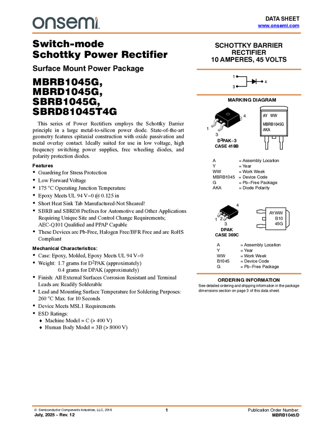 Schottky Power Rectifier, Switch-mode, 10 A, 45 V
