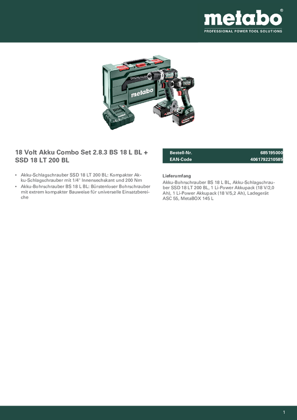 Wiertarko-wkrętarka akumulatorowa, Wkrętarka udarowa akumulatorowa Metabo BSLBL+SSD200LTBL 685195000 18 V 5.2 Ah zaw. ak