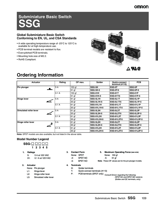 Switch Snap Action N.O./N.C. SPDT Pin Plunger PC Pins 0.1A 250VAC 250VDC 1.5N Thru-Hole