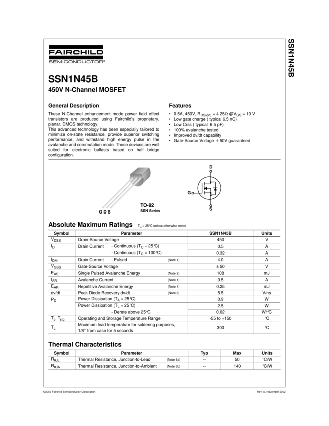 Power MOSFET, N-Channel, B-FET, 450 V, 0.5 A, 4.25 Ω, TO-92