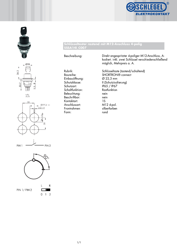 Schlegel SSSA14I_C007 SSSA14I_C007 Przycisk kluczykowy manualne, klucz 1 szt.
