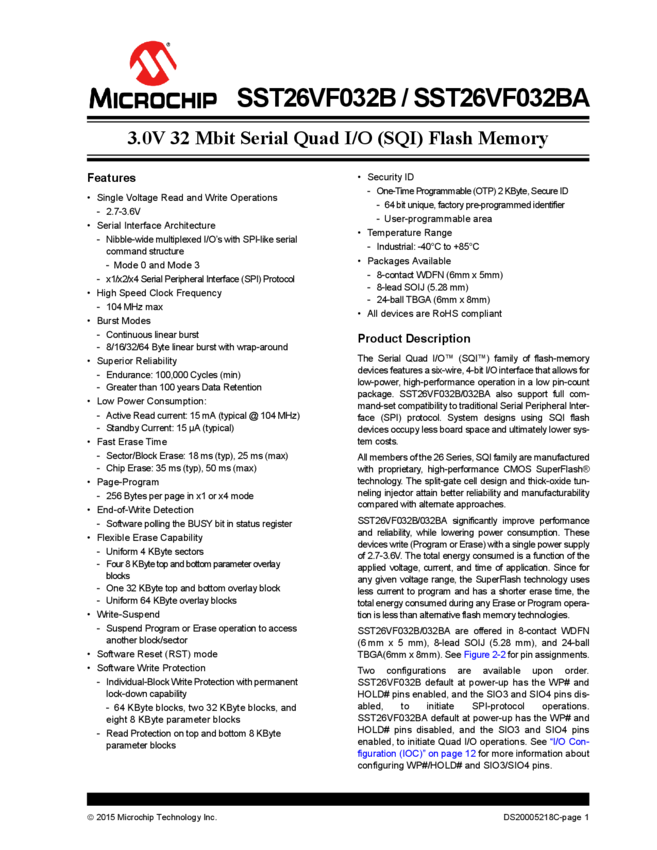 SST26VF032B / SST26VF032BA 2.5V/3.0V 32 Mbit Serial Quad I/O (SQI) Flash Memory (08/24/2015)