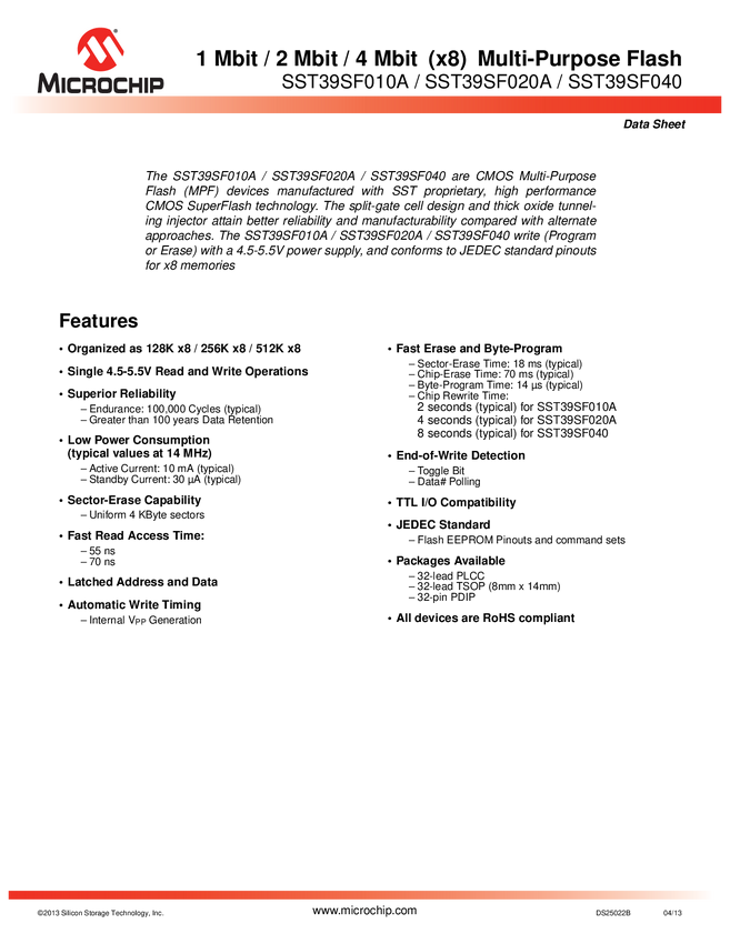 SST39SF010A/SST39SF020A/SST39SF040 - 1-Mbit/2-Mbit/4-Mbit (x8) Multi-Purpose Flash