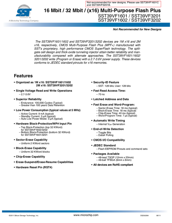 32 Mbit (x16) Multi-Purpose Flash Plus - SST39VF3201C / SST39VF3202C (06/06/2011)