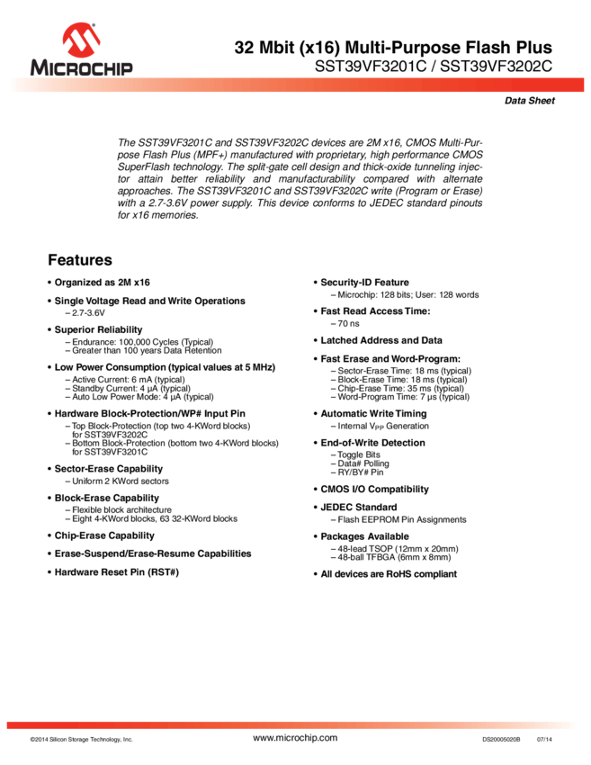 32 Mbit (x16) Multi-Purpose Flash Plus - SST39VF3201C / SST39VF3202C (07/25/2014)